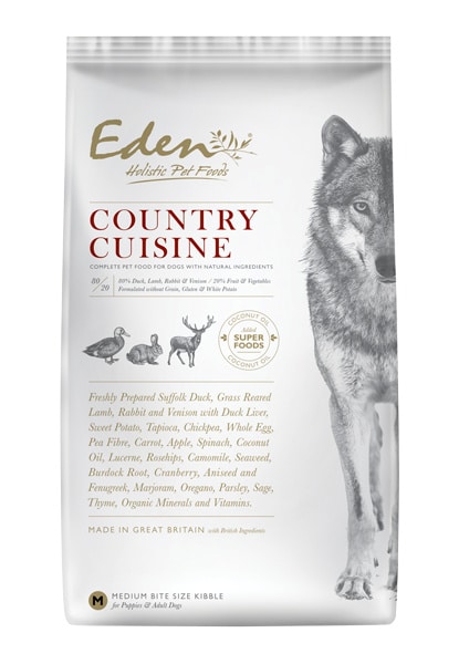 Een graanvrije voeding voor honden uit Groot-Brittanniƫ met 80% vlees en 20% groenten en fruit. Eden Country Cuisine is een uitgebalanceerde voeding voor uw hond met een hoog vleesgehalte (eend, lam, konijn en hert) die volledig vrij is van graan, gluten en witte aardappel. De Country Cuisine is ook uitermate geschikt voor honden die allergisch zijn voor kip. Deze soort bevat de "superfood" kokosolie.