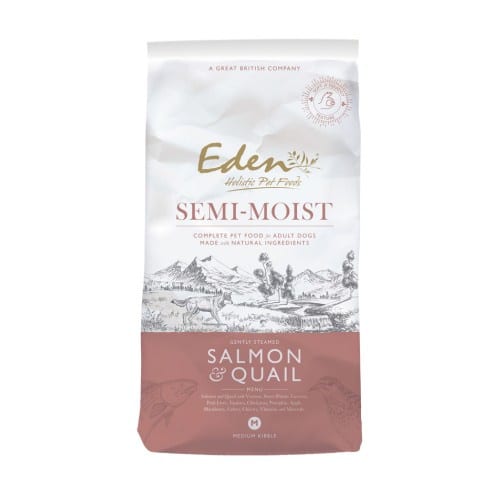 Semi-Moist Salmon & Quail is een zachte en malse voeding met 60% vlees en 40% groenten en fruit. Door het speciale productieproces en de toevoeging van natuurlijke plantaardige glycerine bevat deze voeding ongeveer dubbel zoveel vocht als een normale krokante brok. Semi-Moist Salmon & Quail bevat zalm, kwartel, varken en wild.