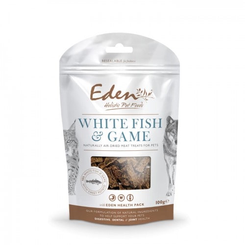 Traktatie met 70% natuurlijk lucht gedroogd witte vis en wild vlees met zoete aardappel en een Eden Health Pack (mengsel van organische vitaminen en mineralen die de gezondheid bevorderen). Uitermate geschikt voor honden met allergieën/intoleranties.