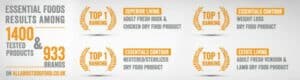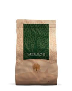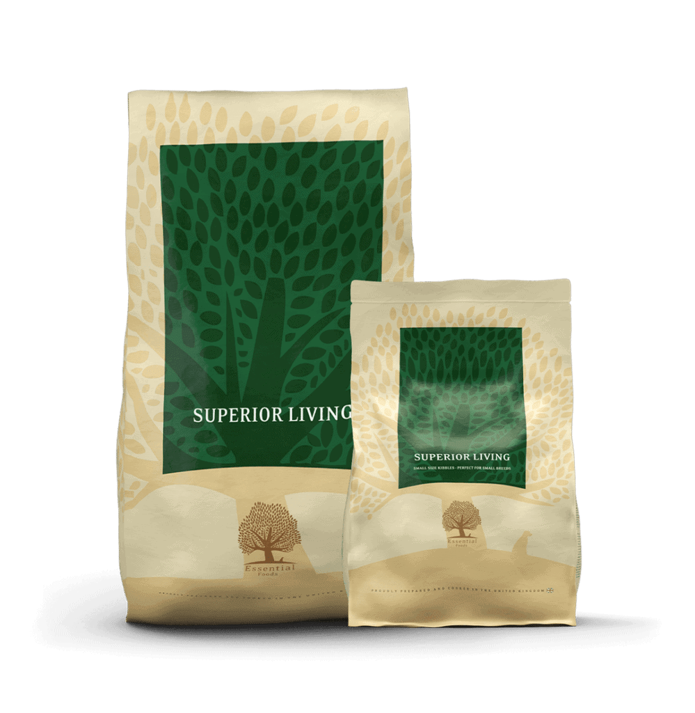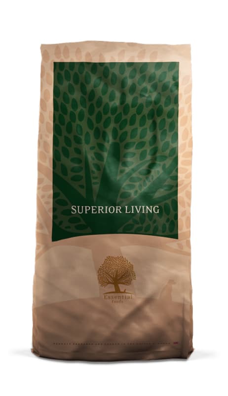 Essential Foods Superior Living is een unieke graanvrije maaltijd voor volwassen honden van alle rassen. Bereid met 80% verse en gedroogde scharrelkip en vrij lopende eenden, verantwoord gekweekte zalm en Salisbury regenboogforel, en ei. Hiervan is 45 % vers vlees en verse eieren (als % van het totale recept). Aangevuld met 20 % Groenten, zaden, kruiden, bessen, fruit, vitaminen en mineralen.