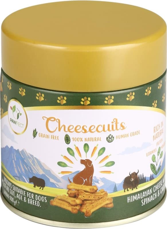Net als de originele Pawfect Churpi-kauwrepen, worden de cheese biscuits gemaakt volgens hetzelfde traditionele recept en proces. Deze gezonde Pawfect Cheese Biscuits zijn gemaakt van meer dan 70% authentieke Himalaya kaas voorzien van groenten en fruit. Verpakt in een leuk afsluitbaar blikje en goed voor een gezonde beloning tussendoor. Je kunt de biscuits ook in kleine stukjes verstoppen in bijvoorbeeld een snuffelmat.