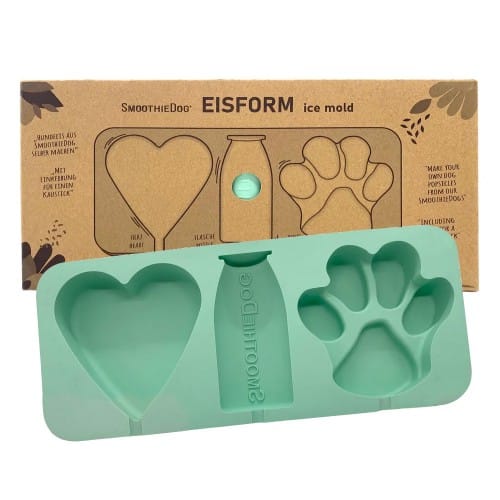 Hondenijsjes in een handomdraai met SmoothieDog en deze supercoole ijsjesvorm. Drie verschillende vormpjes laten hondentongen sneller kwijlen. Natuurlijk is er een SmoothieDog flesje, een super mooi hartje en een trendy pootje. De ijsjesvorm is zo ontworpen dat kauwstokjes naar keuze in de vorm kunnen worden gestoken als ijslollystok en extra knabbelplezier. De ijsvorm is van de beste kwaliteit en zeer elastisch en slijtvast. BPA-vrij en gemaakt van 100% siliconen -